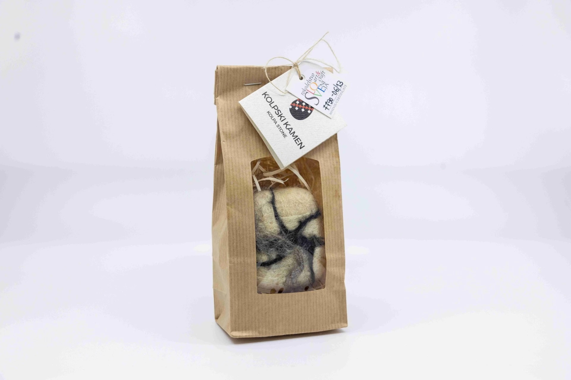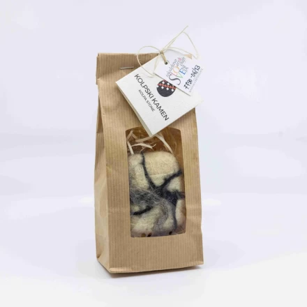 Die Seife ist ein einzigartiges Produkt. Es handelt sich um eine Naturseife, die mit gefilzter Wolle der einheimischen Schafrasse umwickelt ist. Sie ist mit natürlichen Farben gefärbt. Sie massiert, belebt und wäscht die Haut sanft.