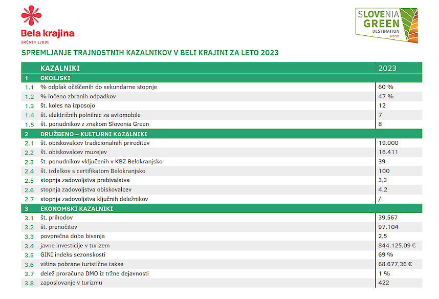 V Strategiji razvoja turizma destinacije Bela krajin 2024 – 2019, Bela krajina SKUPAJ je opredeljen ukrep Spremljanje izbranih trajnostnih kazalnikov (1.5.2). V destinacijski management organizaciji smo opredelili nabor trajnostnih kazalnikov za katere bomo izvajali redni monitoring. Ker je pomembno, da se podatki spremljajo skozi daljše časovno obdobje, smo za izhodiščno leto izbrali 2023.