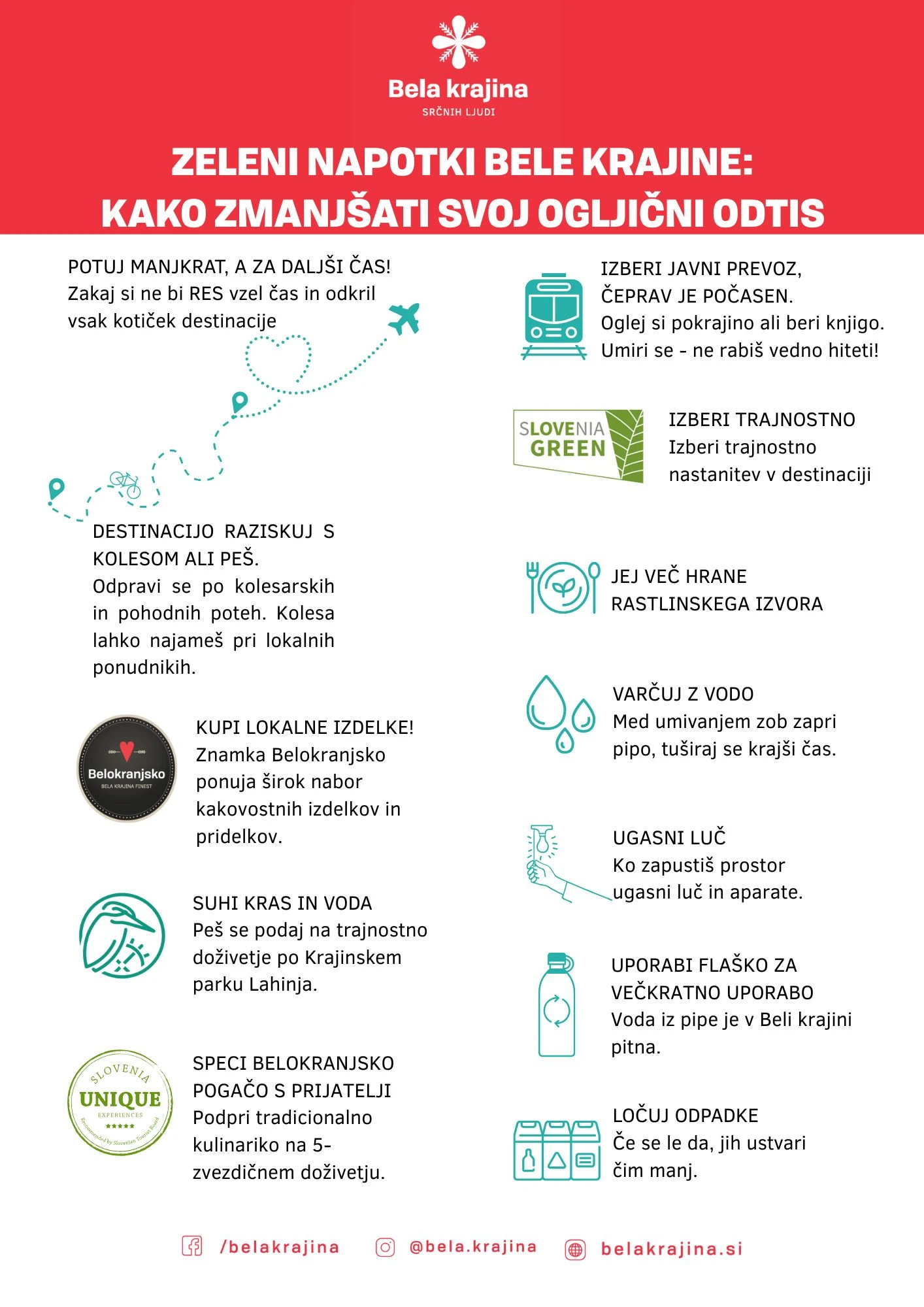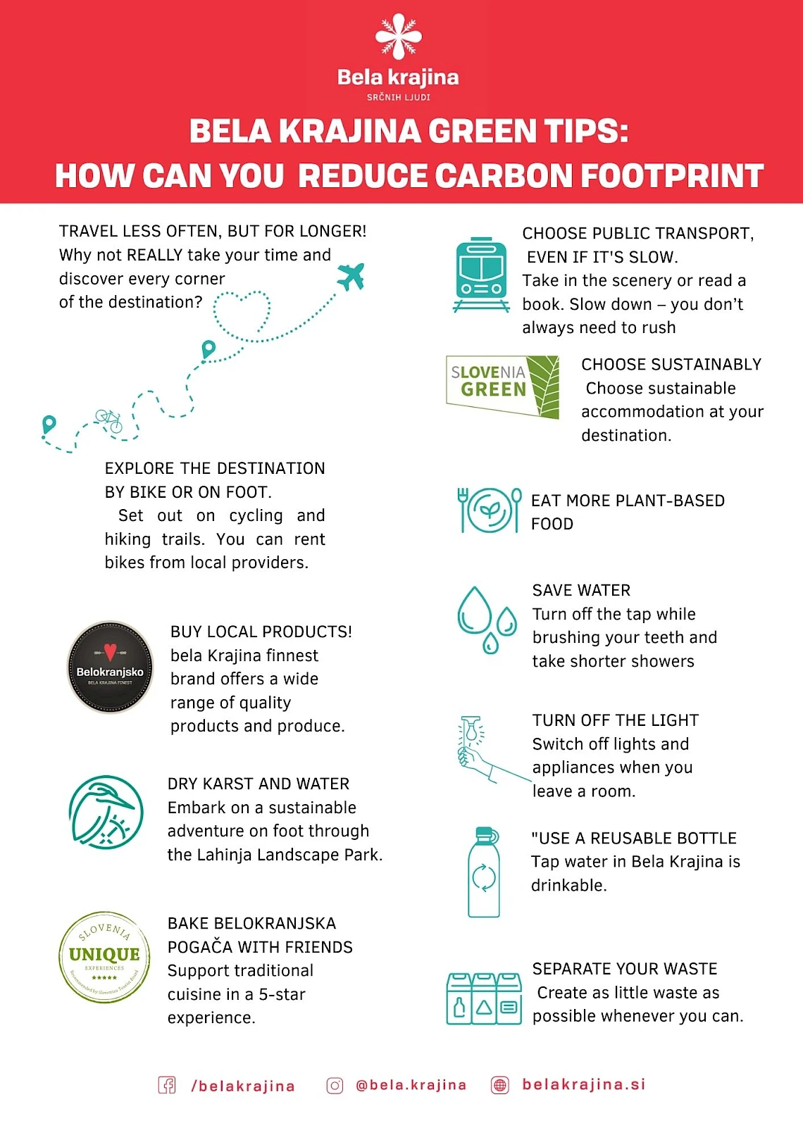 Podnebne spremembe pomembno vplivajo na življenje in turizem, zato je spremljanje ogljičnega odtisa ključno za trajnostno upravljanje destinacij. Bela krajina mora v skladu z Zeleno shemo slovenskega turizma izračunati ogljični odtis ter opredeliti ukrepe za njegovo zmanjšanje in izravnavo.