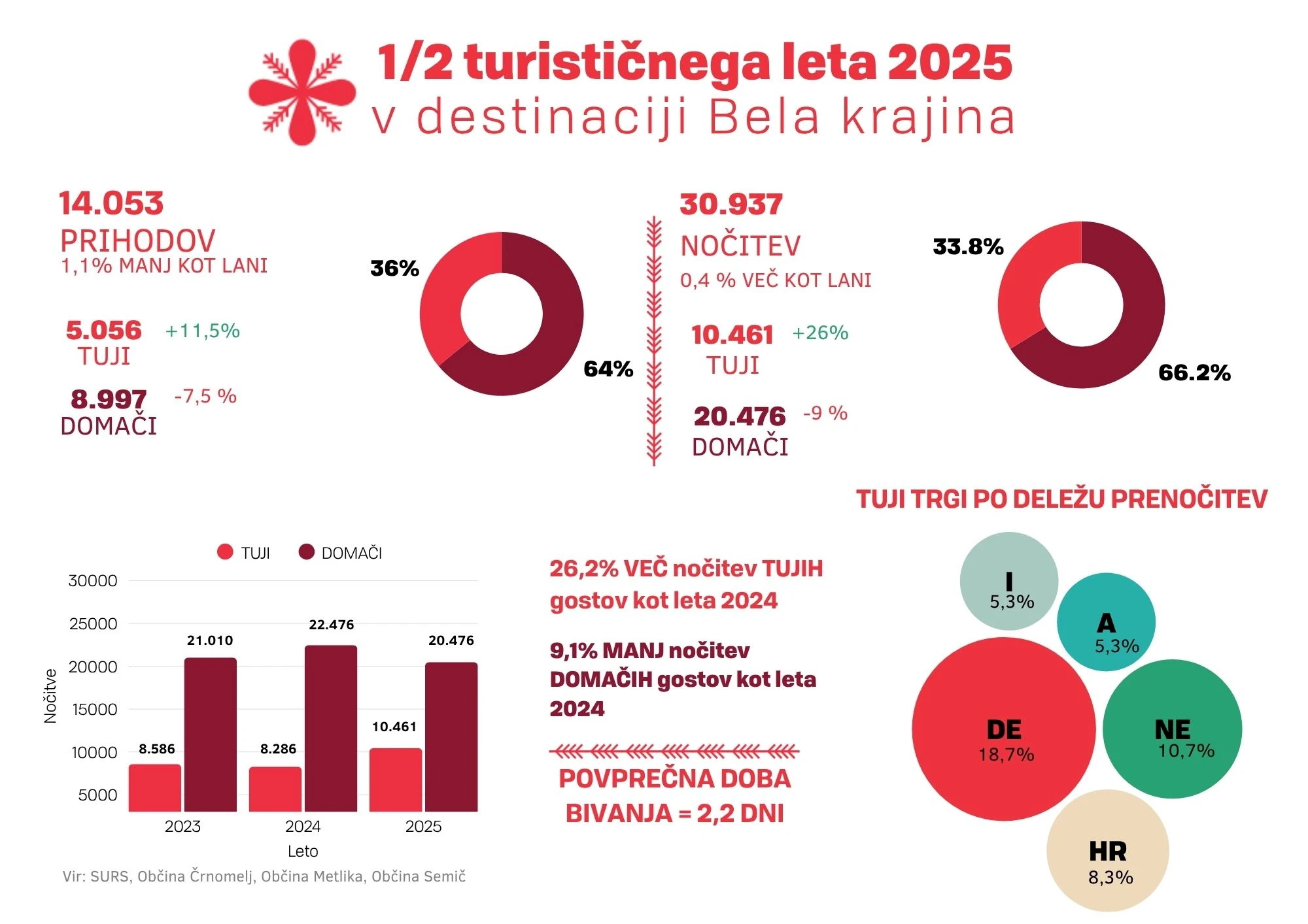 Bela krajina je v prvih šestih mesecih leta 2025 beležila 14.053 prihodov turistov, kar je 1,1 % manj kot v istem obdobju lani. Kljub temu je bilo v prvi polovici leta skupno ustvarjenih 30.937 nočitev, kar pomeni rahlo rast (+0,4 %). Glede na podatke iz toplejših mesecev (maj, junij) se še vedno kaže sezonskost destinacije. Opažamo, da je tudi v poletnih mesecih obisk v Beli krajini nekoliko manjši, kar lahko odseva turistično dogajanje na Hrvaškem in zanimanje za gorske občine. Vsekakor pa bo potrebno počakati številke konec leta.