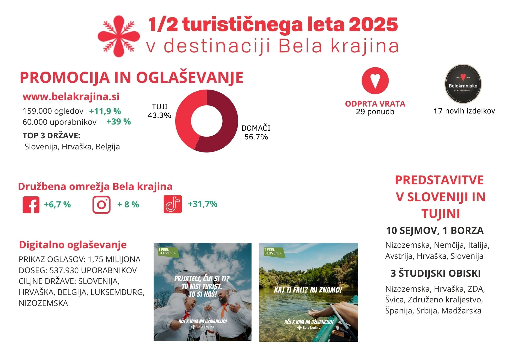 Povečana digitalna prepoznavnost in rast obiska na spletnih kanalih kažejo, da interes za Belo krajino narašča, zlasti iz Nizozemske in Hrvaške. Vendar pa analiza nočitev (glede na prejšnje podatke) kaže, da Bela krajina še ni med ključnimi izbirami tujih turistov, kar ostaja strateški izziv za drugo polovico leta. Bela krajina ima v rokah dobre temelje – naslednji korak je njihova pretvorba v daljša bivanja.