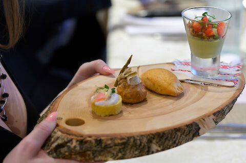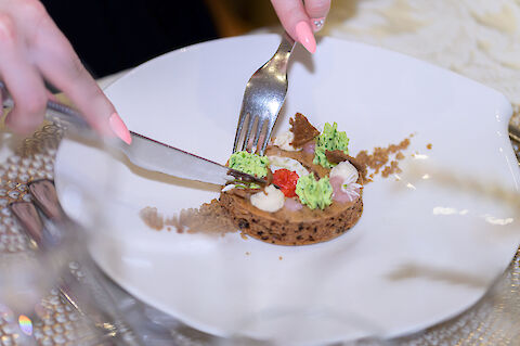 Ljubitelji kulinarike so večer pričeli s kar štirimi pozdravi iz kuhinje vsakega gostinca. Nadaljevali smo s hladno predjedjo Hotela Bela krajina. Na krožniku je bilo čemaževo maslo in mousse iz dimljene postrvi na krekerju z ajdovim drobljencem in jagodami.