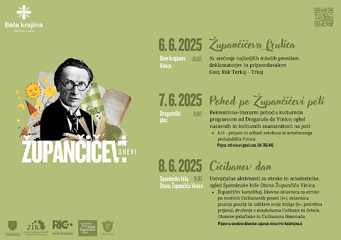 Vikend med 𝟔. 𝐢𝐧 𝟖. 𝐣𝐮𝐧𝐢𝐣𝐞𝐦 𝟐𝟎𝟐𝟓 bo obarvan kulturno, pohodniško in ustvarjalno. V čast belokranjskemu, otroškemu in vseslovenskemu mojstru besede 𝐎𝐭𝐨𝐧𝐮 𝐙̌𝐮𝐩𝐚𝐧𝐜̌𝐢𝐜̌𝐮 bodo potekali Župančičevi dnevi. Poleg že 35. tradicionalne 𝐙̌𝐮𝐩𝐚𝐧𝐜̌𝐢𝐜̌𝐞𝐯𝐞 𝐟𝐫𝐮𝐥𝐢𝐜𝐞, na kateri se bodo predstavili najboljši slovenski mladi pesniki, deklamatorji in pripovedovalci, se boste lahko podali na 𝐏𝐨𝐡𝐨𝐝 𝐩𝐨 𝐙̌𝐮𝐩𝐚𝐧𝐜̌𝐢𝐜̌𝐞𝐯𝐢 𝐩𝐨𝐭𝐢 po slikoviti belokranjski pokrajini, najmlajši pa preživeli ustvarjalni 𝐂𝐢𝐜𝐢𝐛𝐚𝐧𝐨𝐯 𝐝𝐚𝐧 v družbi Cicibana in čebele ter slastnih Otonovih palačink, ki jih bodo pripravili pri Turizmu Zeleni Jurij.